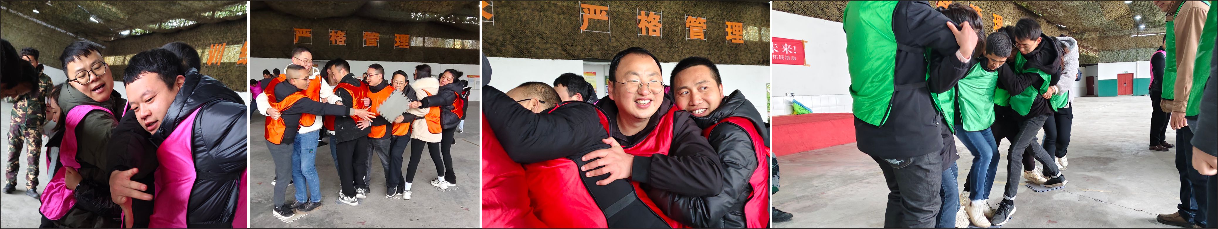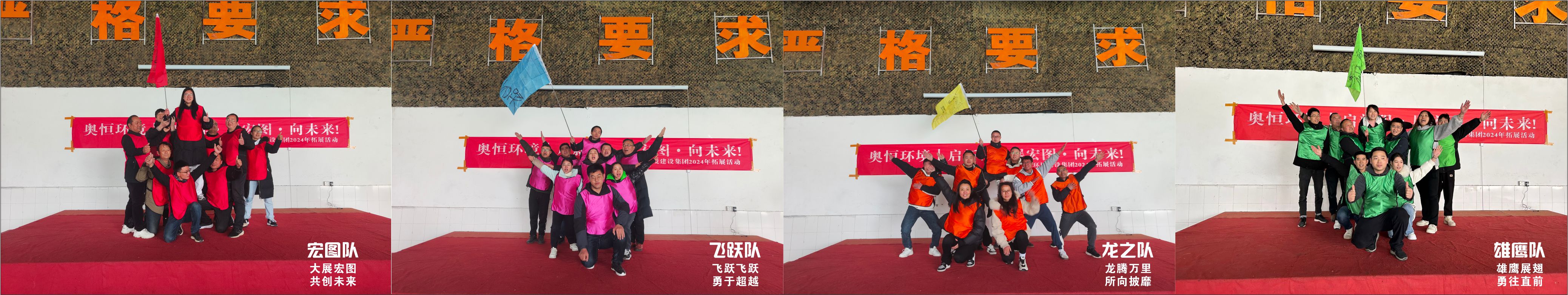 此次拓展訓(xùn)練活動(dòng),以軍事訓(xùn)練為主,強(qiáng)調(diào)團(tuán)隊(duì)的團(tuán)結(jié)合作服從精神,通過各種拓展游戲活動(dòng),增強(qiáng)團(tuán)隊(duì)凝聚力。首先,教官將我們的團(tuán)隊(duì)分成四個(gè)小隊(duì),后續(xù)活動(dòng)中,以四小隊(duì)的形式參與活動(dòng)游戲比拼。分別組建宏圖隊(duì)、龍之隊(duì)、飛躍隊(duì)、雄鷹隊(duì)四支充滿激情的隊(duì)伍。每支小隊(duì)集思廣益取了一個(gè)響亮的振奮人心的口號(hào)。